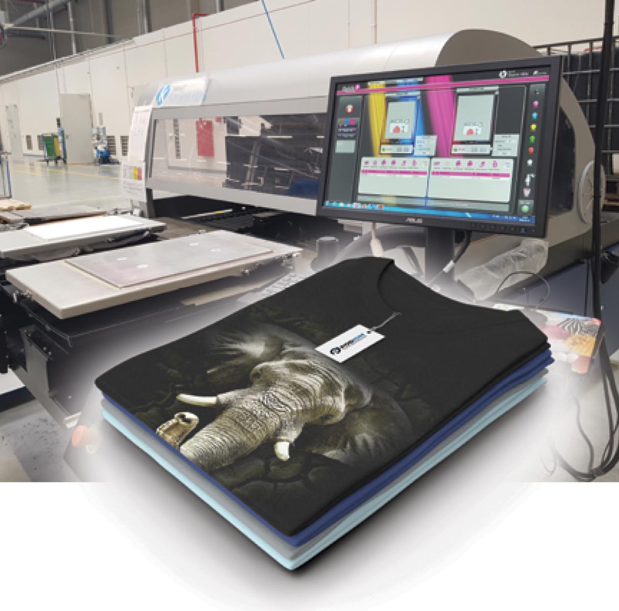 This technology avoids visible traces of pallet trays on the printed garment.